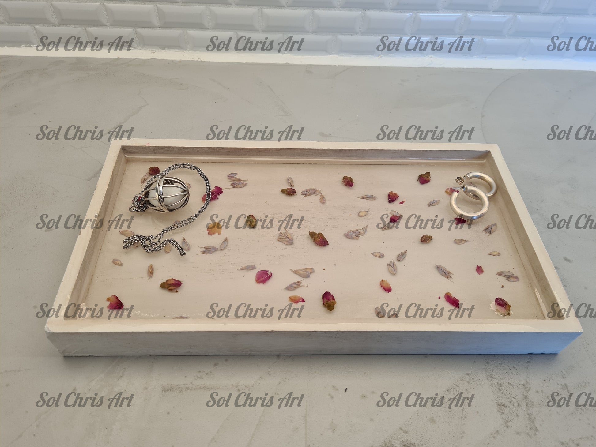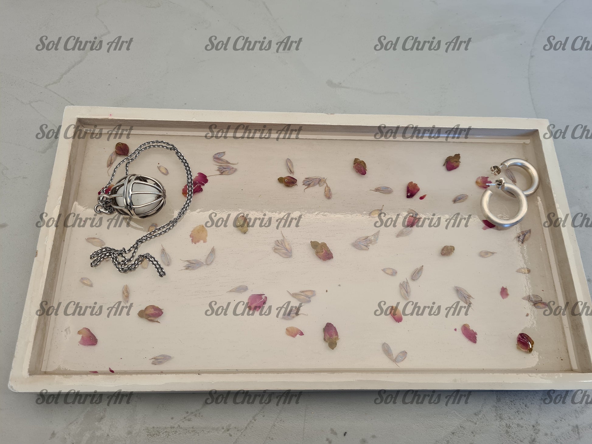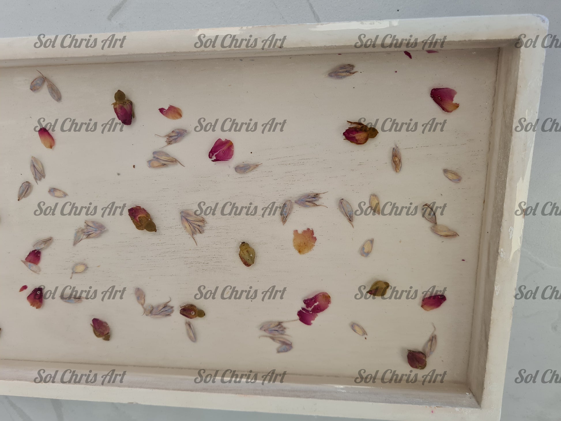 I denne træbakke er der blevet støbt med resin, rosenknopper og andre blomsterblade. Den måler ca. 23cm x 18cm.