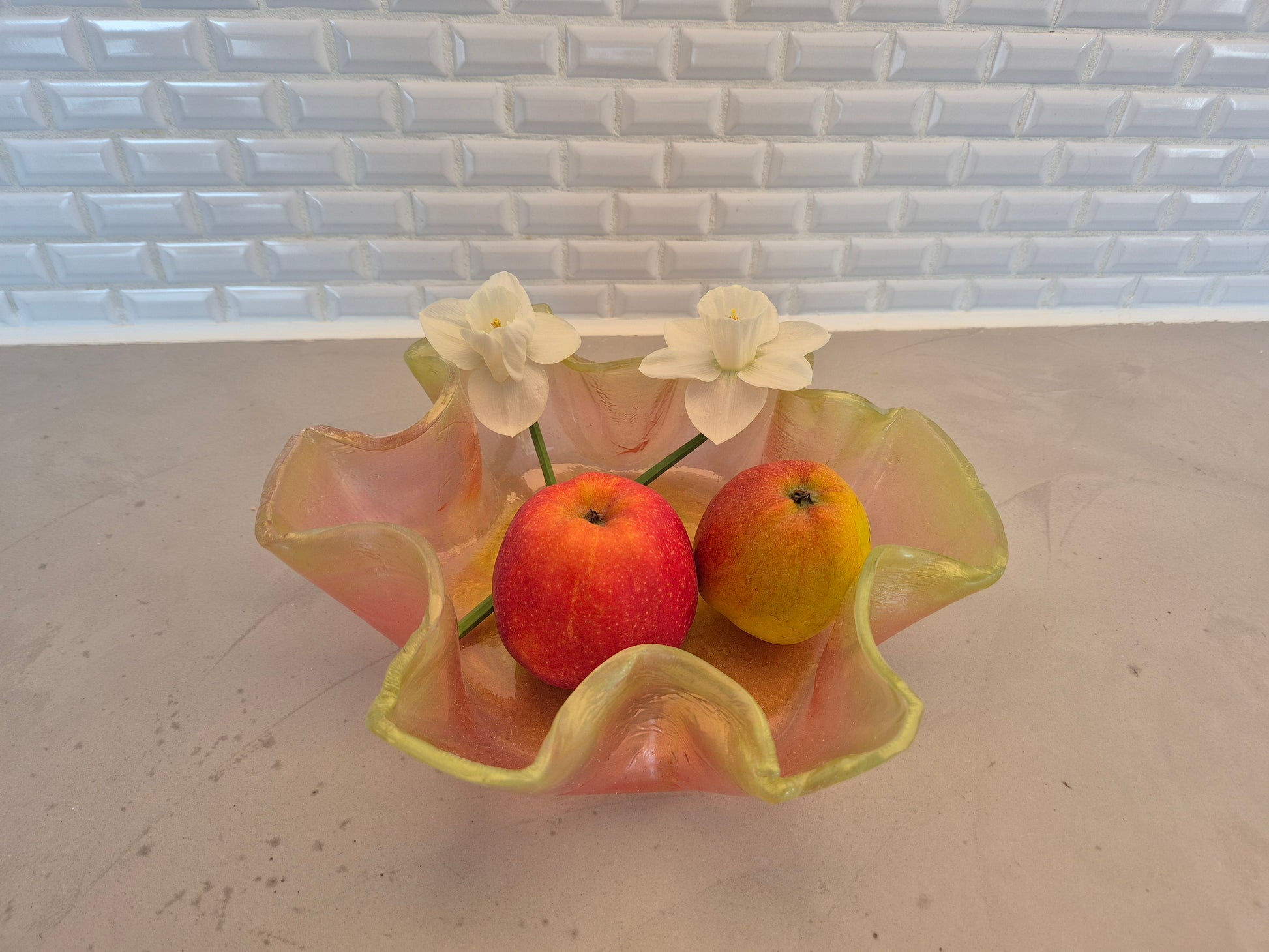 Unik håndlavet forårsskål i resin med mica pulverfarver Ø ca 22 cm.